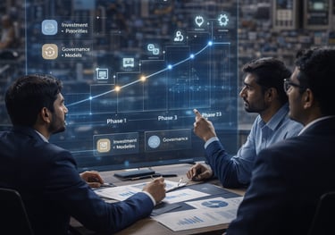 We define phase-wise digital transformation roadmaps, investment priorities, and governance models—ensuring technology adoption is practical, measurable, and aligned with business strategy.